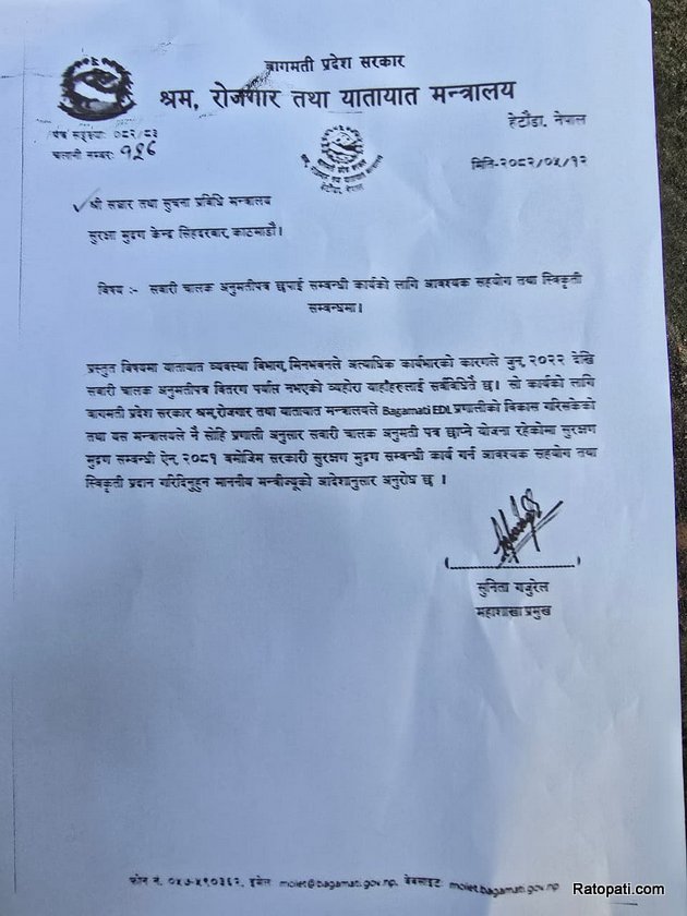 काठमाडौँ । प्रदेश सरकारलाई लाइसेन्स प्रिन्ट गर्न अनुमति दिन माग गर्दै मुद्रण विभागमा पत्र बुझाइएको छ । बिहीबार युवा आवाज नामक सङ्गठनले विभागमा पत्र बुझाएको हो । भाद्र २३ गते भ्रष्टाचार विरुद्ध भएको आन्दोलन केवल भ्रष्टाचारको विरोध मात्र नभई सरकारी कामकाजमा देखिएको ढिलासुस्ती, लापरबाही र प्रशासनिक जटिलताबाट नागरिकहरूले भोग्नुपरेको असन्तोष, रिस, र उत्तेजनाको संयुक्त अभिव्यक्तिको रूपमा देखिएको उनीहरुले बताएका छन् । त्यसैले अहिलेको अस्थामा लाइसेन्स छाप्न प्रदेशलाई समेत अधिकार दिन माग गर्दै पत्र बुझाइएको उनीहरुले बताएका छन् ।