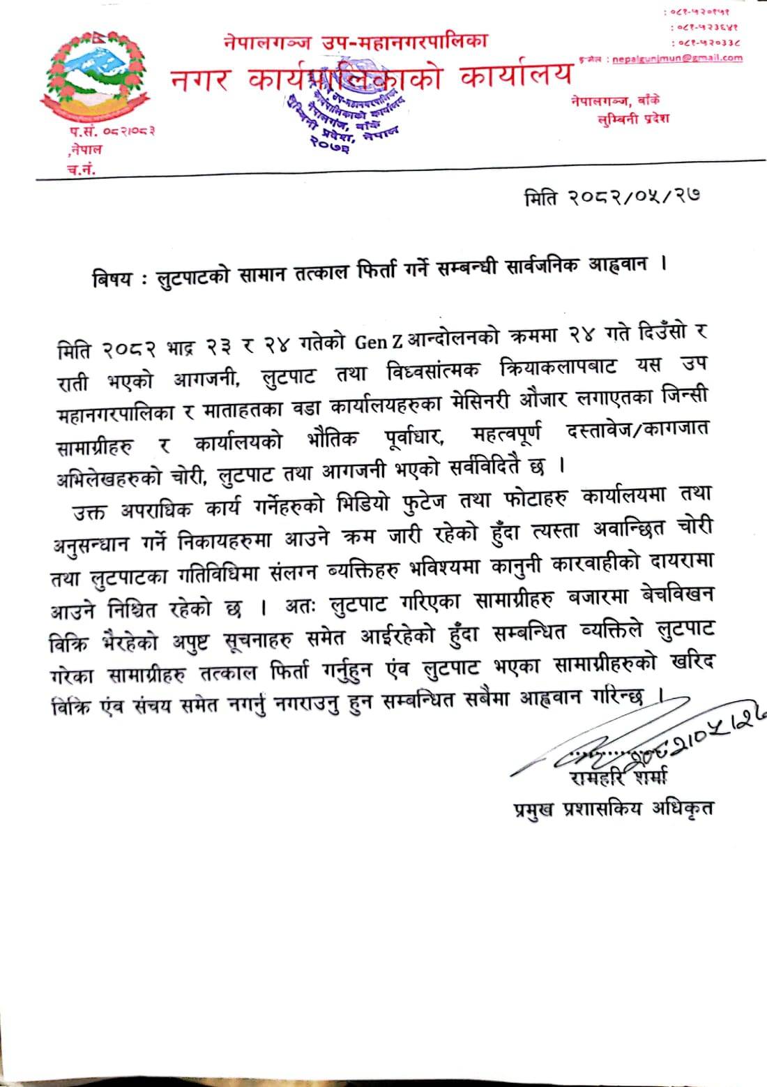 नेपालगन्ज । नेपालगन्ज उपमहानगरपालिकाले लुटपाटको सामान तत्काल फिर्ता गर्न सार्वजनिक आह्वान गरेको छ । प्रमुख प्रशासकीय अधिकृत रामहरि शर्माले आज एक सार्वजनिक सूचना जारी गरी सामान फिर्ता गर्न आग्रह गरेका हुन् । २०८२ भदौ २३ र २४ गतेको जेनजी आन्दोलनको क्रममा २४ गते दिउँसो र राती नेपालगन्ज उपमहानगरपालिका कार्यालयमा भएको आगजनी, लुटपाट तथा विध्वसांत्मक क्रियाकलापबाट उपमहानगरपालिका र माताहतका वडा कार्यालयहरुका मेसिनरी औजार लगायतका जिन्सी सामग्रीहरु र कार्यालयको भौतिक पूर्वाधार, महत्वपूर्ण दस्तावेज/कागजात अभिलेखहरुको चोरी, लुटपाट तथा आगजनी भएको सर्वविदितै छ,सार्वजनिक सूचनामा भनिएको छ-